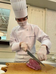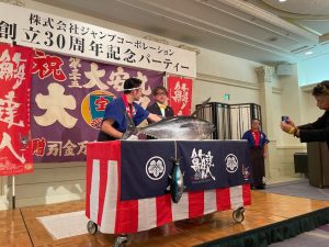 大きなマグロを、大きな包丁?刀?で切っていきます。